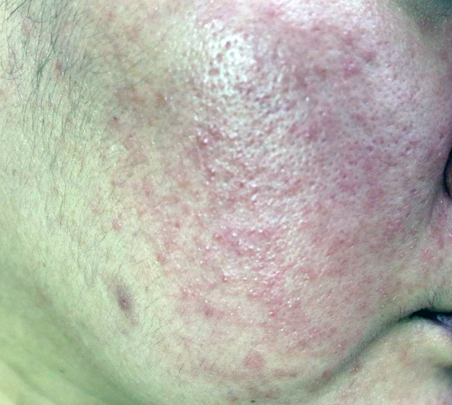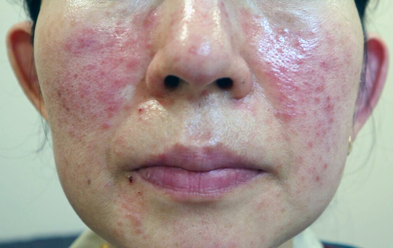 초기에는 홍조로 시작하여, 지속적인 홍반과 모세혈관확장으로 발전하게 됩니다. 심해질 경우 모낭성 염증성 구진과 농포, 염증성 결절, 조직의 증식으로 악화 과정을 경험합니다.